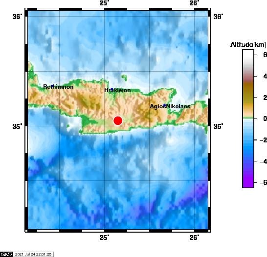 Το ακριβές επίκεντρο τη δόνησης εντοπίζεται στα 20 χλμ. νότια-νοτιοανατολικά του Ηράκλειου Κρήτης και στα 9 χλμ. νοτιοανατολικά από τις Άνω Αρχάνες.