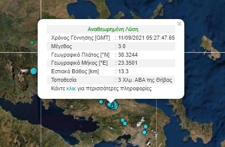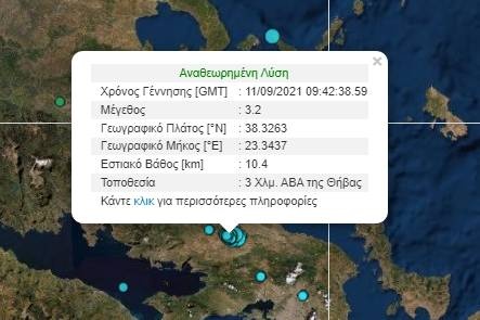 Νέα σεισμική δόνηση 3,2 Ρίχτερ σημειώθηκε στις 12:42 το Σάββατο (11/9) στην ευρύτερη περιοχή της Θήβας. Η δόνηση είχε επίκεντρο στα τρία χιλιόμετρα ανατολικα - βορειοανατολικά της Θήβας, με εστιακό βάθος στα 10,4 χιλιόμετρα.