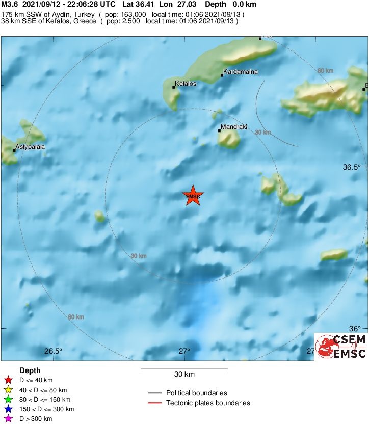 Ο νέος σεισμός, μεγέθους 3,6 βαθμών της κλίμακας Ρίχτερ (σύμφωνα με την αυτόματη λύση του Ευρωπαϊκού EMSC), σημειώθηκε στις 01:06 μετά τα μεσάνυχτα (Δευτέρα 13/9).