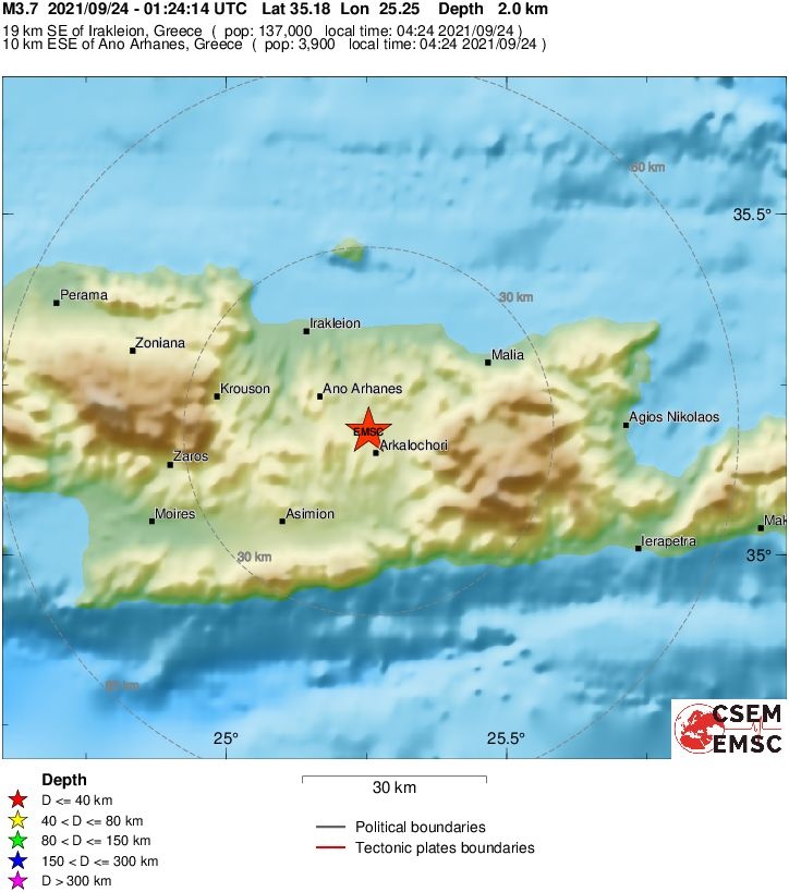 Σεισμός Τώρα: Ασθενής σεισμική δόνηση μεγέθους 3,7 βαθμών της κλίμακας Ρίχτερ, σύμφωνα με την αναθεωρημένη λύση του Ευρωπαϊκού - Μεσογειακού Σεισμολογικού Ινστιτούτου (EMSC), σημειώθηκε τα ξημερώματα της Παρασκευής (24/9), στις 04:24, κοντά στο Αρκαλοχώρι του Ηρακλείου Κρήτης.