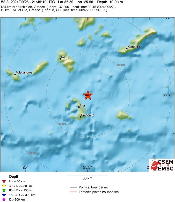 Σεισμός Τώρα: Ασθενής σεισμική δόνηση μεγέθους 3,8 βαθμών της κλίμακας Ρίχτερ, σύμφωνα με την αυτόματη λύση του Ευρωπαϊκού - Μεσογειακού Σεισμολογικού Ινστιτούτου (EMSC), σημειώθηκε στις 00:45 μετά τα μεσάνυχτα (Δευτέρα 27/9), σε περιοχή των νότιων Κυκλάδων, κοντά στη Σαντορίνη.