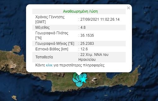 Νέος ισχυρός μετασεισμός 4,8 Ρίχτερ καταγράφηκε στην Κρήτη στις 14.02 το μεσημέρι της Δευτέρας 22 χιλιόμετρα νότια νοτιοανατολικά του Ηρακλείου