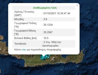 Σεισμός μεγέθους 3,9 βαθμών της κλίμακας Ρίχτερ σημειώθηκε στις 18:34 της Παρασκευής (1/10) στην Κρήτη, με τη μετασεισμική δραστηριότητα να συνεχίζεται μετά τα 5,8 Ρίχτερ της περασμένης Δευτέρας.