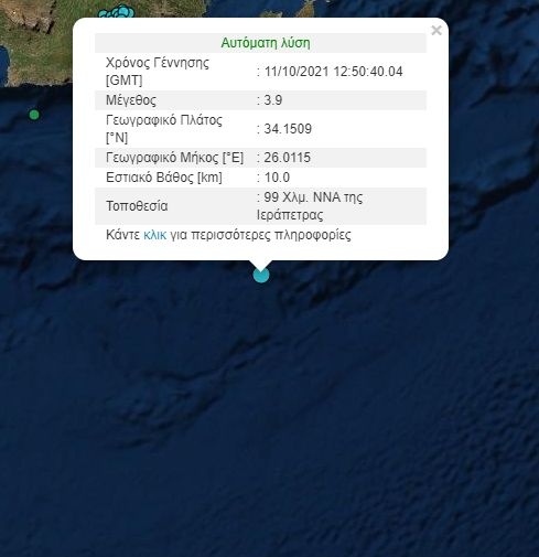 Το επίκεντρο του σεισμού εντοπίζεται στα 99 χιλιόμετρα νοτιοανατολικά της Ιεράπετρας ενώ το εστιακό βάθος είναι στα 10 χιλιόμετρα.