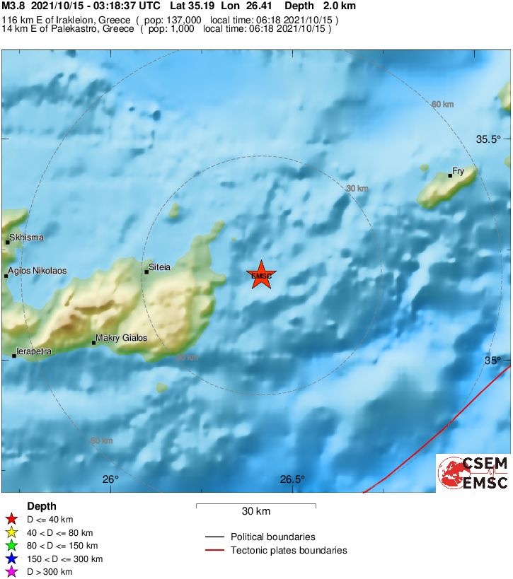 Σεισμός Τώρα: Ασθενής σεισμική δόνηση μεγέθους 3,8 βαθμών της κλίμακας Ρίχτερ, σύμφωνα με την αυτόματη λύση του Ευρωπαϊκού - Μεσογειακού Σεισμολογικού Ινστιτούτου (EMSC), σημειώθηκε το πρωί της Παρασκευής (15/10), στις 06:18, σε υποθαλάσσια περιοχή, κοντά στις ανατολικές ακτές του Λασιθίου.