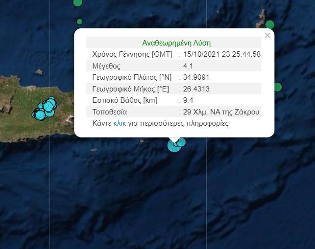 Το επίκεντρο του σεισμού εντοπίστηκε 29χλμ νοτιοανατολικά της Ζάκρου ενώ το εστιακό βάθος υπολογίζεται στα 9χλμ.