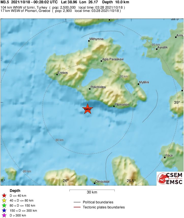 Σεισμός Τώρα: Ασθενής σεισμική δόνηση μεγέθους 3,5 βαθμών της κλίμακας Ρίχτερ, σύμφωνα με την αυτόματη αναθεωρημένη λύση του Ευρωπαϊκού - Μεσογειακού Σεισμολογικού Κέντρου (EMSC), σημειώθηκε τα ξημερώματα της Δευτέρας (18/10), στις 03:28, σε περιοχή του βορείου Αιγαίου, κοντά στις νότιες ακτές της Μυτιλήνης.