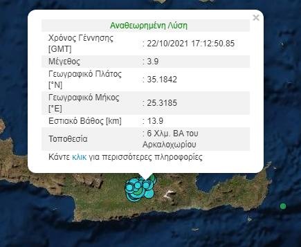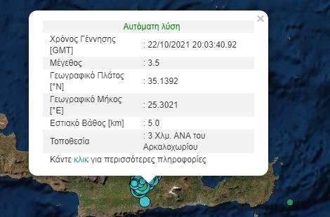 Νέα σεισμική δόνηση σημειώθηκε στις 23:03 την Παρασκευή, 22 Οκτωβρίου, στην Κρήτη.