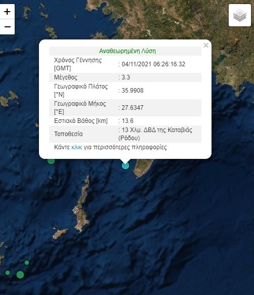 Σεισμική δόνηση μεγέθους 3,3 Ρίχτερ, σημειώθηκε το πρωί της Πέμπτης στη Ρόδο, στις 13 χιλιόμετρα δυτικά βορειδυτικά της Καταβιάς.