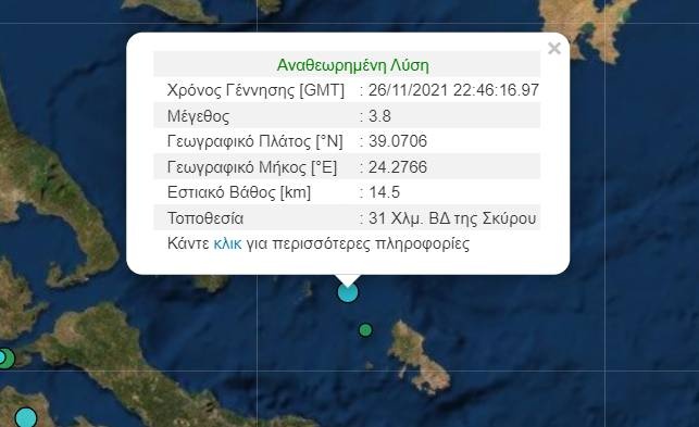 Το επίκεντρο του σεισμου εντοπίζεται στον θαλάσσιο χώρο 31χλμ βορειοδυτικά της Σκύρου, με το εστιακό βάθος να υπολογίζεται στα 15χλμ.
