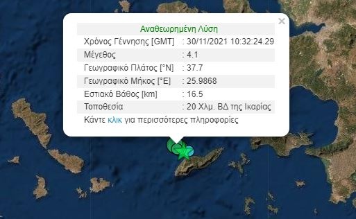 Συγκεκριμένα ο σεισμός σημειώθηκε στις 12:32 το μεσημέρι της Τρίτης και το επίκεντρο εντοπίστηκε 20χλμ. βορειοδυτικά της Ικαρίας.