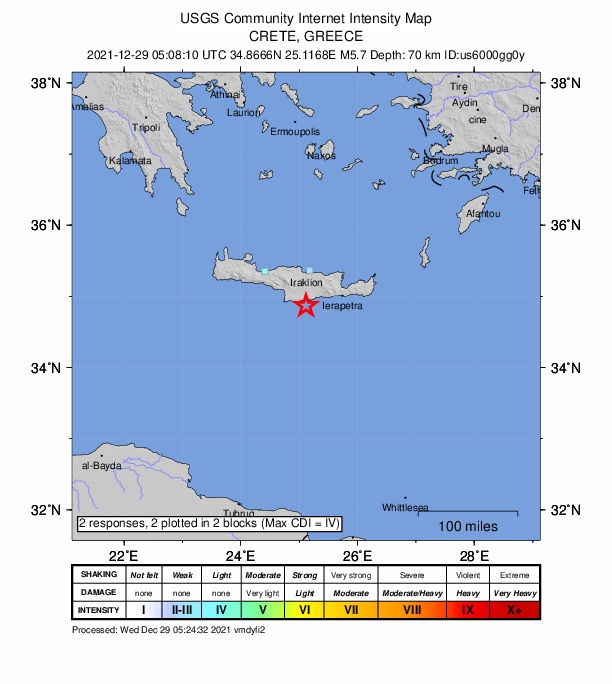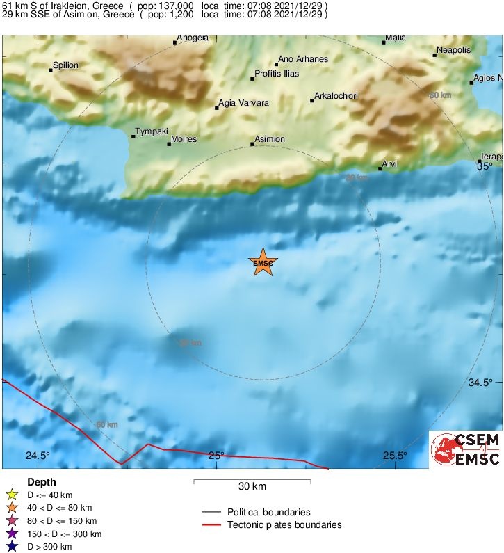 Το ακριβές επίκεντρο τη δόνησης εντοπίζεται στα 89 χλμ. νότια του Ηρακλείου Κρήτης.