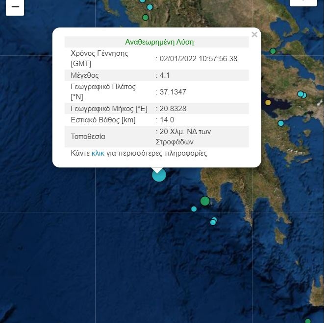 Η σεισμική δόνηση σημειώθηκε στη 12:57 το μεσημέρι και είχε ένταση 4,1 βαθμούς της Κλίμακας Ρίχτερ. Το επίκεντρο του σεισμού εντοπίζεται 20 χλμ. νοτιοδυτικά των Στροφάδων και το εστιακό βάθος υπολογίζεται σε 14 χλμ.