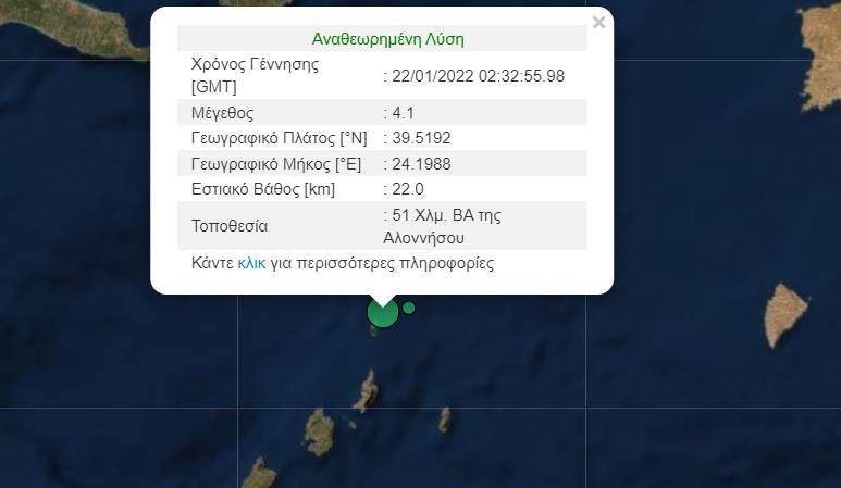 Σεισμός 4,1 βαθμών της κλίμακας Ρίχτερ έγινε αισθητός στις 4:32 τα ξημερώματα του Σαββάτου στο θαλάσσιο χώρο της Αλοννήσου.