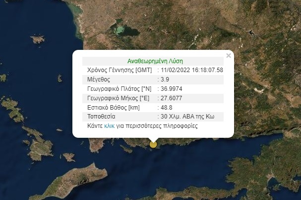 Ο σεισμός είχε εστιακό βάθος 10χλμ, ενώ το επίκεντρο του σεισμού εντοπίζεται στα 31χλμ ανατολικά της Κω.