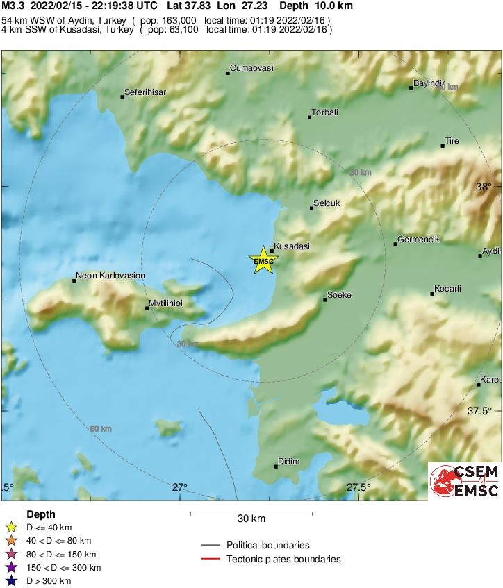 Σεισμός Τώρα: Ασθενής -αλλά αισθητή- σεισμική δόνηση μεγέθους 3,2 βαθμών της κλίμακας Ρίχτερ, σύμφωνα με την αυτόματη λύση του Ευρωπαϊκού - Μεσογειακού Σεισμολογικού Κέντρου (EMSC), σημειώθηκε στις 00:19 μετά τα μεσάνυχτα (Τετάρτη 16/2), σε υποθαλάσσια περιοχή, κοντά στις βορειοανατολικές ακτές της Σάμου.