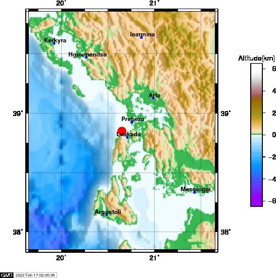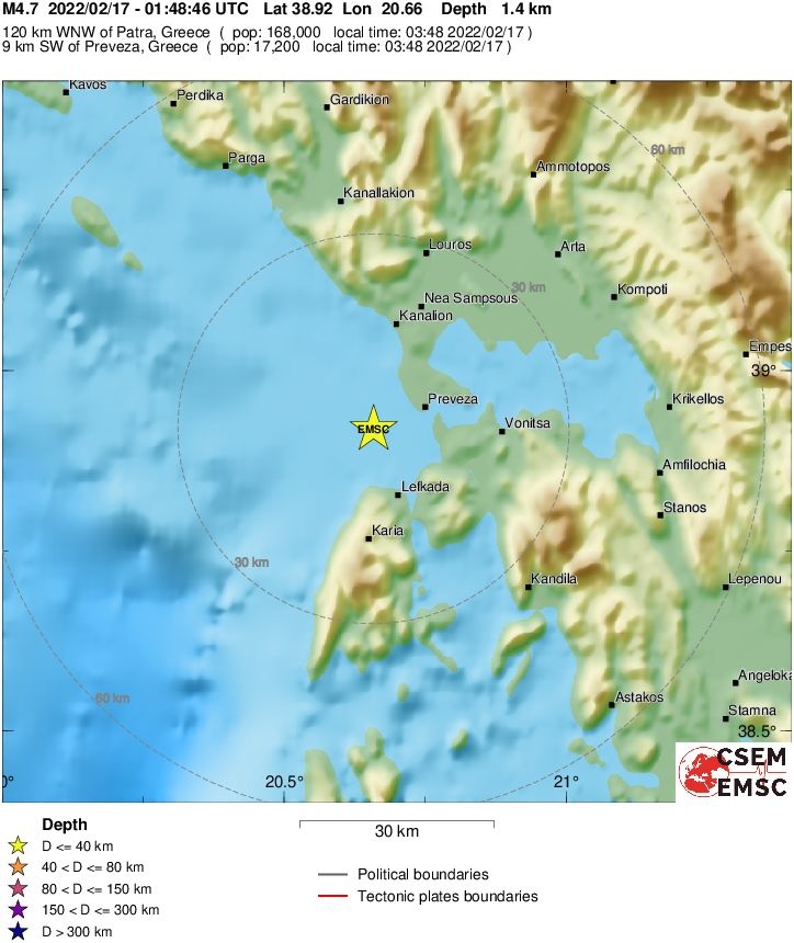 Το ακριβές επίκεντρο της δόνησης εντοπίζεται στα 9 χλμ. νοτιοδυτικά της Πρέβεζας, σύμφωνα με το EMSC.
