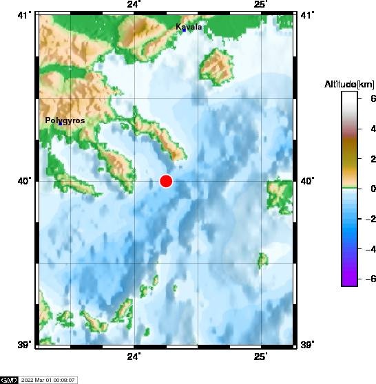 H αυτόματη λύση του Γεωδυναμικού Ινστιτούτου του Αστεροσκοπείου Αθηνών δίνει το σεισμό στα 3,5 Ρίχτερ, με εστιακό βάθος τα 19,3 χλμ., και επίκεντρο τα 16 χλμ. νοτιοδυτικά του Άθου.