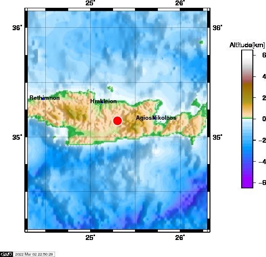 Μετασεισμική δόνηση μεγέθους 3,1 βαθμών της κλίμακας Ρίχτερ, σύμφωνα με την αυτόματη λύση του Ευρωπαϊκού - Μεσογειακού Σεισμολογικού Ινστιτούτου (EMSC), σημειώθηκε 45 λεπτά μετα τα μεσάνυχτα (Πέμπτη 3/3), κοντά στο Αρκαλοχώρι του Ηρακλείου Κρήτης.