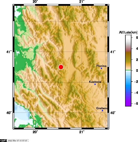 Το ακριβές επίκεντρο τη δόνησης εντοπίζεται στα 17 χλμ. νότια - νοτιοδυτικά της Καστοριάς.