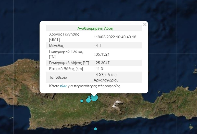 Σεισμική δόνηση έντασης 4,1 Ρίχτερ σημειώθηκε στις 12:40 το μεσημέρι του Σαββάτου (19/03) στο Αρκαλοχώρι.