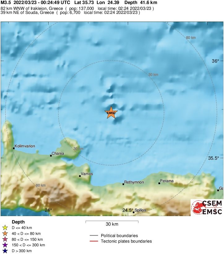 H αναθεωρημένη λύση του Γεωδυναμικού Ινστιτούτου του Αστεροσκοπείου Αθηνών δίνει το σεισμό στα 3,6 Ρίχτερ, με εστιακό βάθος τα 44,7 χλμ., και επίκεντρο τα 39 χλμ. βόρεια των Χανίων.