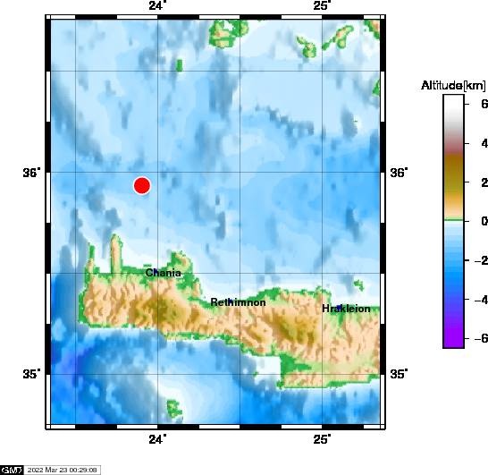Το ακριβές επίκεντρο τη δόνησης εντοπίζεται στα 39 χλμ. βόρεια - βορειοανατολικά της Σούδας.