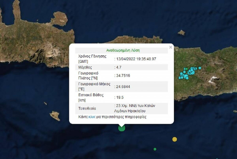 Ο σεισμός σημειώθηκε στις 10:35 το βράδυ της Τετάρτης στη θαλάσσια περιοχή νότια της Κρήτης. Η δόνηση έγινε αισθητή σε πολλές περιοχές του νησιού, μεταξύ των οποίων και στην πόλη του Ηρακλείου.