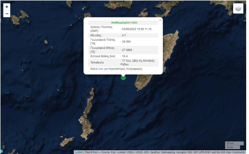 Το απόγευμα της Παρασκευής (3/6) ισχυρός σεισμός ταρακούνησε τη Ρόδο. Σύμφωνα με την αναθεωρημένη λύση του Γεωδυναμικού Ινστιτούτου, ο σεισμός ήταν 4,7 Ρίχτερ.