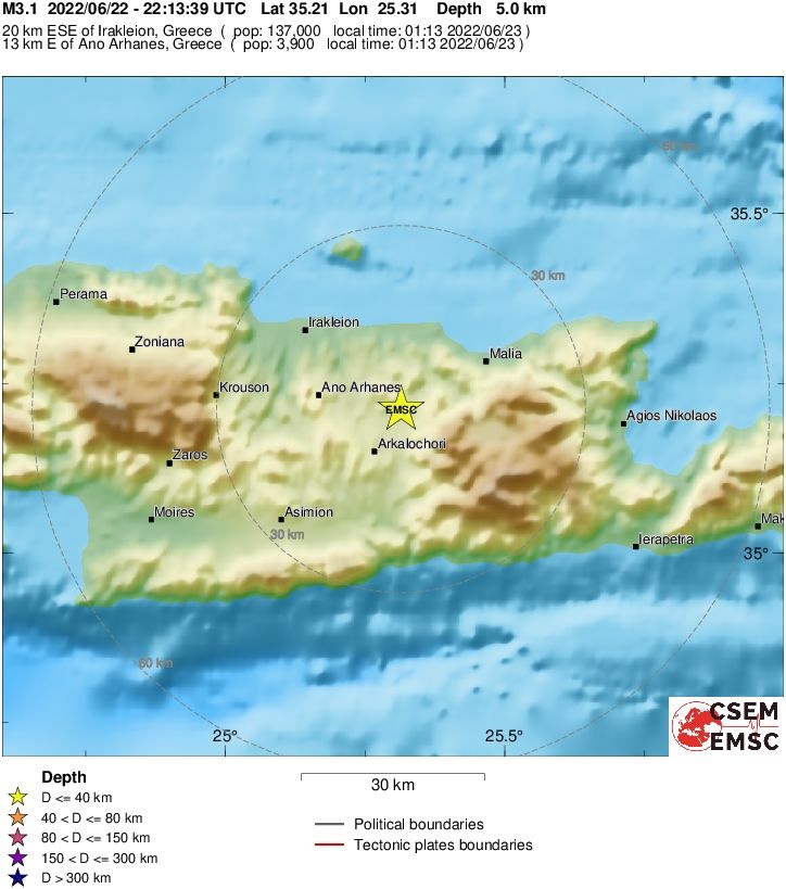 Σεισμός Τώρα: Ασθενής μετασεισμική δόνηση μεγέθους 3,1 βαθμών της κλίμακας Ρίχτερ, σύμφωνα με την αυτόματη λύση του Ευρωπαϊκού - Μεσογειακού Σεισμολογικού Ινστιτούτου (EMSC), σημειώθηκε στη 01:13 μετά τα μεσάνυχτα (Πέμπτη 23/6), κοντά στο Αρκαλοχώρι του Ηρακλείου Κρήτης.
