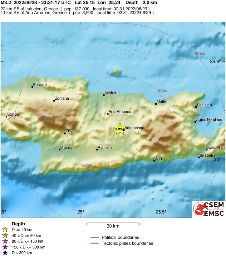 Σεισμός Τώρα: Ασθενής μετασεισμική δόνηση μεγέθους 3,2 βαθμών της κλίμακας Ρίχτερ, σύμφωνα με την αυτόματη λύση του Ευρωπαϊκού - Μεσογειακού Σεισμολογικού Ινστιτούτου (EMSC), σημειώθηκε στις 02:31 μετά τα μεσάνυχτα (Τετάρτη 29/6), κοντά στο Αρκαλοχώρι του Ηρακλείου Κρήτης.