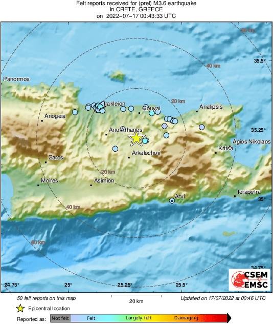 Μετασεισμική δόνηση μεγέθους 3,6 βαθμών της κλίμακας Ρίχτερ, σύμφωνα με την αυτόματη λύση του Ευρωπαϊκού - Μεσογειακού Σεισμολογικού Ινστιτούτου (EMSC), σημειώθηκε τα ξημερώματα της Κυριακής (17/7), στις 03:43, κοντά στο Αρκαλοχώρι του Ηρακλείου Κρήτης.
