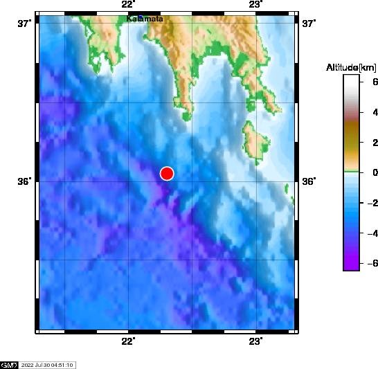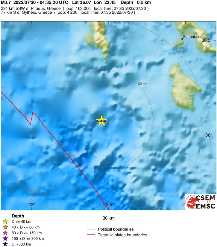 Το ακριβές επίκεντρο τη δόνησης, σύμφωνα με την εκτίμηση του EMSC εντοπίζεται στα 77 χλμ. νότια του Γυθείου.