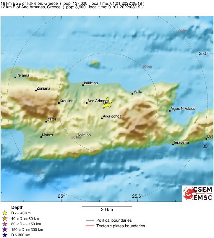 Σεισμός Τώρα: Ασθενής μετασεισμική δόνηση μεγέθους 3,2 βαθμών της κλίμακας Ρίχτερ, σύμφωνα με την αυτόματη λύση του Ευρωπαϊκού - Μεσογειακού Σεισμολογικού Ινστιτούτου (EMSC), σημειώθηκε τα ξημερώματα της Παρασκευής (19/7), στη 01:01, κοντά στο Αρκαλοχώρι του Ηρακλείου Κρήτης.