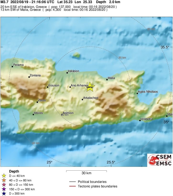 Σεισμός Τώρα: Ασθενής μετασεισμική δόνηση μεγέθους 3,7 βαθμών της κλίμακας Ρίχτερ, σύμφωνα με την αυτόματη λύση του Ευρωπαϊκού - Μεσογειακού Σεισμολογικού Ινστιτούτου (EMSC), σημειώθηκε στις 00:16 μετά τα μεσάνυχτα (Σάββατο 20/8), κοντά στο Αρκαλοχώρι του Ηρακλείου Κρήτης.