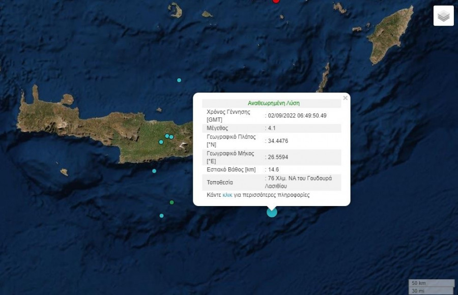 Συγκεκριμένα, σύμφωνα με την αναθεωρημένη λύση του Γεωδυναμικού Ινστιτούτου Αθηνών, ο σεισμός είχε επίκεντρο 76χλμ ΝΑ του Γουδουρά Λασιθίου, ενώ το εστιακό βάθος ήταν στα 14,6χλμ.