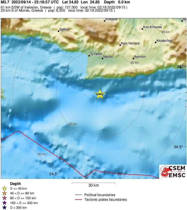 Σεισμός Τώρα: Ασθενής σεισμική δόνηση μεγέθους 3,7 βαθμών της κλίμακας Ρίχτερ, σύμφωνα με την αυτόματη λύση του Ευρωπαϊκού - Μεσογειακού Σεισμολογικού Ινστιτούτου (EMSC), σημειώθηκε τα ξημερώματα της Πέμπτης (15/9), στις 02:18, κοντά στις νότιες ακτές του Ηρακλείου, στο Νότιο Κρητικό Πέλαγος.