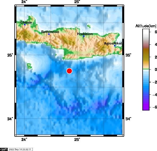 Το ακριβές επίκεντρο τη δόνησης εντοπίζεται στα 61 χλμ. νότια - νοτιοδυτικά του Ηρακλείου Κρήτης.
