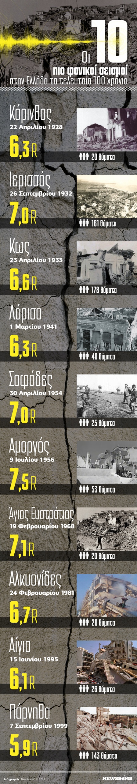 Στο παρελθόν, η Ελλάδα έχει πληρώσει βαρύ «φόρο αίματος» στους σεισμούς. Ο Ελλαδικός χώρος γενικότερα, από την αρχαιότητα έχει καταστραφεί πολλές φορές από χτυπήματα του Εγκέλαδου. Ακόμα και ο μύθος της χαμένης Ατλαντίδας, αν είναι μύθος, ξεκινάει με έναν πανίσχυρο σεισμό… Ο Μινωικός πολιτισμός θρυλείται ότι καταστράφηκε από την έκρηξη του ηφαιστείου της Σαντορίνης, που προκάλεσε σεισμούς και τσουνάμι… Ακόμα και μεταγενέστερα, όμως, υπήρξαν ανάλογοι καταστροφικοί σεισμοί. Το 365 μ.Χ. υπολογίζεται ότι 8,7 Ρίχτερ χτύπησαν την Κρήτη με τη δόνηση αυτή να θεωρείται η ισχυρότερη που έχει καταγραφεί ποτέ στη Μεσόγειο.