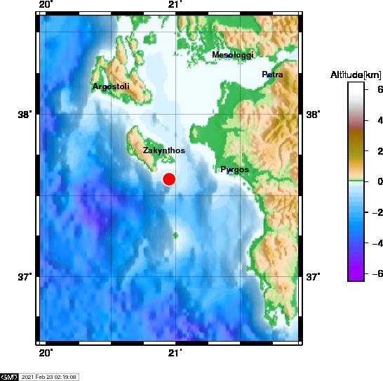 Το ακριβές επίκεντρο της δόνησης εντοπίζεται στα 41 χλμ. νότια από την πόλη της Ζακύνθου σύμφωνα με το EMSC.