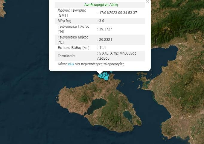 Το επίκεντρο της σεισμικής δόνησης εντοπίστηκε 5χλμ ανατολικά της Μήθυμνας, ενώ το εστιακό βάθος του σεισμού υπολογίζεται στα 11χλμ.
