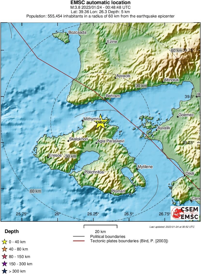 Σεισμός Τώρα: Ασθενής σεισμική δόνηση μεγέθους 3,8 βαθμών της κλίμακας Ρίχτερ, σύμφωνα με την αυτόματη λύση του Ευρωπαϊκού - Μεσογειακού Σεισμολογικού Κέντρου (EMSC), σημειώθηκε τα ξημερώματα της Τρίτης (24/1), στις 02:48, στις βόρειες ακτές της Μυτιλήνης.