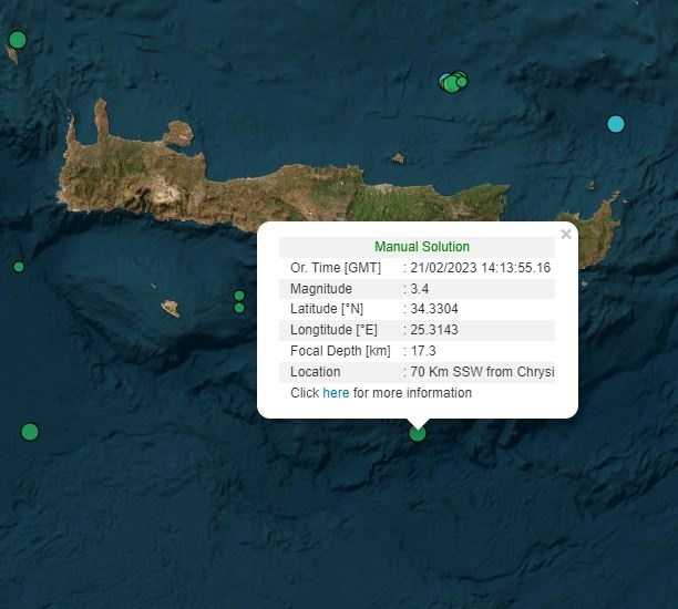 Χθες (20/2) σημειώθηκε σεισμός 3 Ρίχτερ 48 χλμ. βόρεια του Ηρακλείου, στη θάλασσα.