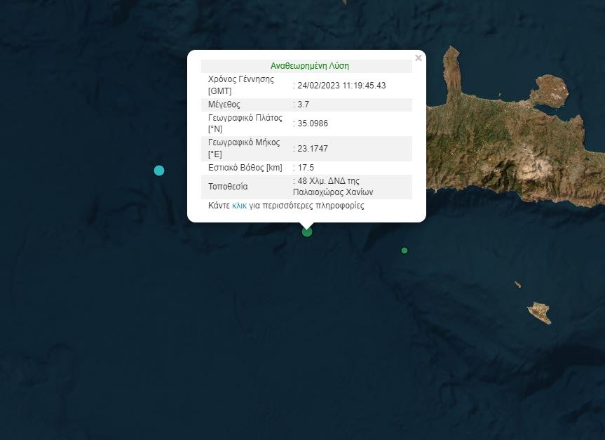 Στη θαλάσσια περιοχή ανοικτά των Χανίων σημειώθηκε ένας ακόμα σεισμός στην Κρήτη, το μεσημέρι της Παρασκευής. Συγκεκριμένα, η δόνηση σημειώθηκε στις 13:19 και ήταν της τάξεως των 3,7 Ρίχτερ.