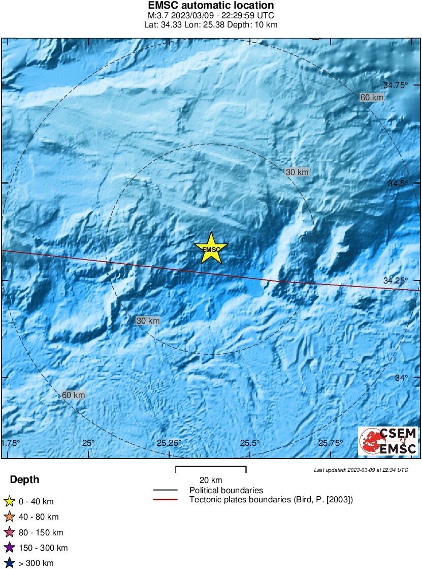 Σεισμός Τώρα: Ασθενής σεισμική δόνηση μεγέθους 3,8 βαθμών της κλίμακας Ρίχτερ, σύμφωνα με την αυτόματη λύση του Ευρωπαϊκού - Μεσογειακού Σεισμολογικού Ινστιτούτου (EMSC), σημειώθηκε στις 00:29 μετά τα μεσάνυχτα (Παρασκευή 10/3), στο Νότιο Κρητικό Πέλαγος.