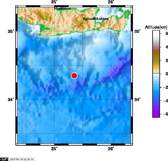 Το ακριβές επίκεντρο τη δόνησης εντοπίζεται στα 113 χλμ. νότια - νοτιοανατολικά του Ηρακλείου Κρήτης.