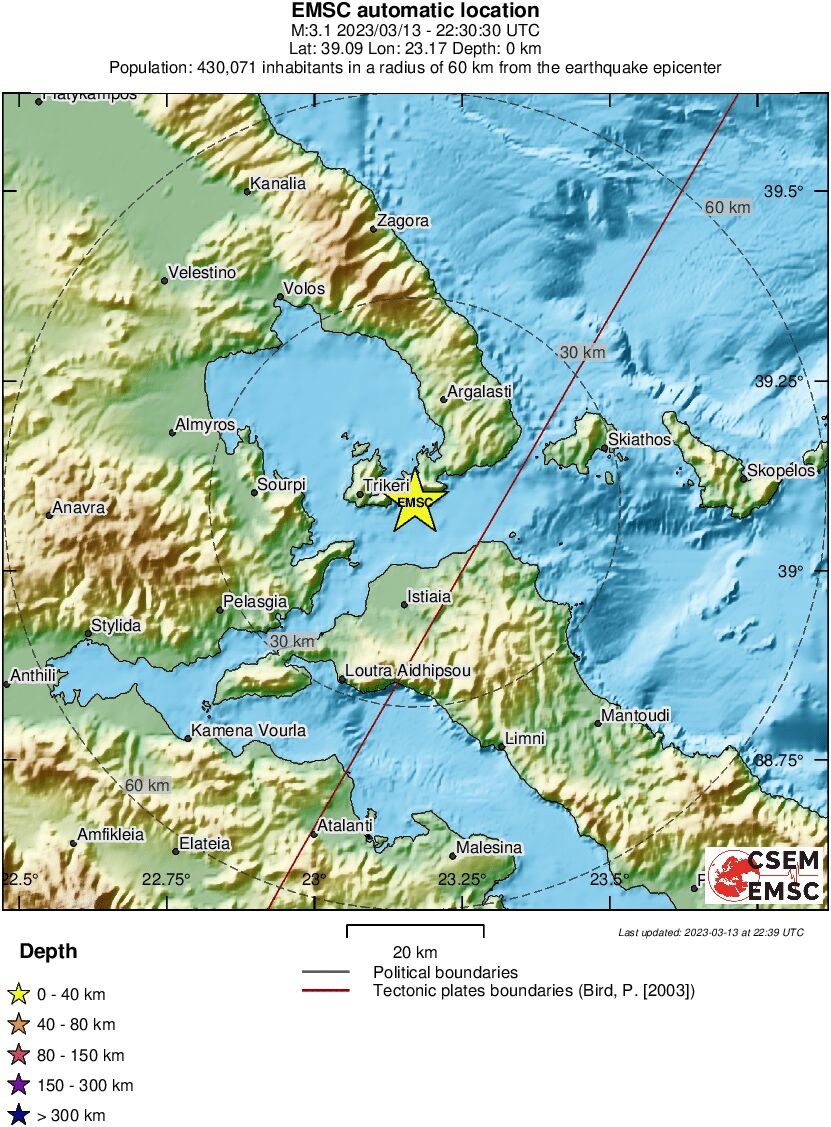 Σεισμός Τώρα: Ασθενής σεισμική δόνηση μεγέθους 3,1 βαθμών της κλίμακας Ρίχτερ, σύμφωνα με την αυτόματη λύση του Ευρωπαϊκού - Μεσογειακού Σεισμολογικού Ινστιτούτου (EMSC), στις 00:30 μετά τα μεσάνυχτα (Τρίτη 14/3), σε υποθαλάσσια περιοχή μεταξύ Βόρειας Εύβοιας και Μαγνησία