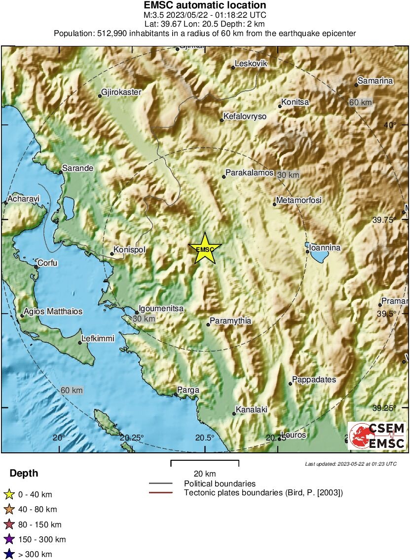 Το ακριβές επίκεντρο της δόνησης εντοπίζεται 27 χλμ. βορειοδυτικά της Ηγουμενίτσας σύμφωνα με το EMSC.