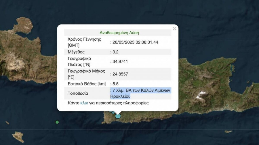 Σεισμός: Το επίκεντρο του σεισμού εντοπίζεται στα 7 χλμ βορειοανατολικά των Καλών Λιμένων Ηρακλείου ενώ το εστιακό βάθος υπολογίζεται στα 8,5 χλμ