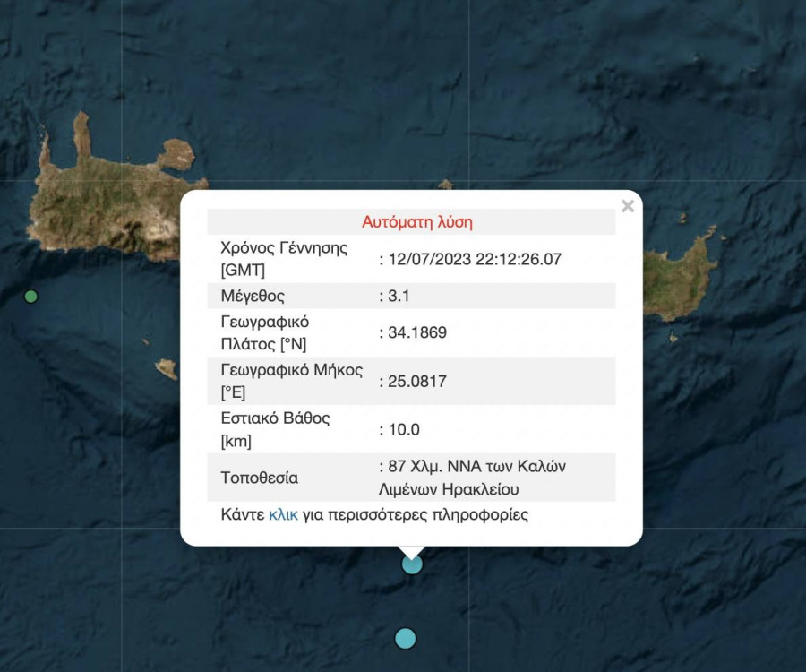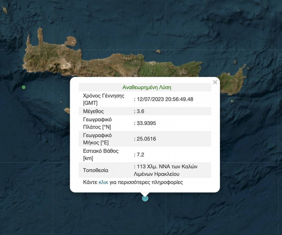 Λίγα λεπτά πριν από τα μεσάνυχτα είχε προηγηθεί σεισμός μεγέθους 3,6 βαθμών της κλίμακας ρίχτερ, με το επίκεντρο, σύμφωνα πάντα με την Αναθεωρημένη Λύση του Γεωδυναμικού Ινστιτούτου, να εντοπίζεται 113 χλμ ΝΝΑ των Καλών Λιμένων Ηρακλείου, ενώ το εστιακό βάθος υπολογίζεται στα 7,2 χλμ.